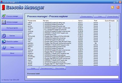 Execute Manager 2.0 este pentru oricine dorește să controleze tot ceea ce se întâmplă pe computerul său. Puteți controla toate procesele - vizualizați modulele lor încărcate, veți ști când un proces a fost pornit sau încheiat, puteți bloca orice proces și, desigur, puteți crea așa-numitele sarcini, care sunt procese cu multe funcții suplimentare. Acest program se bazează pe noua tehnologie NET și este un instrument eficient pentru controlul total asupra computerului dumneavoastră. Atenţie! Programul are nevoie de .NET Framework versiunea 1.1 instalată pentru a rula.