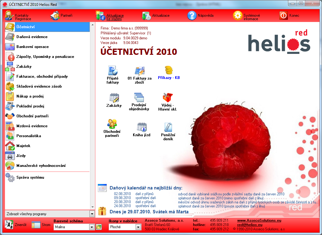 Ghidul utilizatorului tipărit este destinat primilor pași în acest sistem de contabilitate. Securitatea operațiunilor asupra documentelor achiziționate este asigurată de un sistem de creare automată a istoricului documentelor și a protocoalelor de securitate. Scurgerile neautorizate de date pot fi prevenite printr-un sistem ierarhic de drepturi de acces și parole ale utilizatorilor. Backup-ul și arhivarea tuturor datelor sunt gestionate central, inclusiv. verificări automate de integritate. Această opțiune va instala aplicația Helios Red START. Aceasta este o versiune distribuită gratuit a aplicației Helios Red destinată entităților de afaceri mai mici pentru procesarea de rutină a datelor. Această versiune este limitată în modulele individuale de suma totală de 200.000 CZK și de numărul de documente care pot fi achiziționate în acest modul. Versiunea START nu este înregistrată la producător, nu este acoperită de garanția producătorului sau de suportul tehnic. Puteți descărca o actualizare pentru versiunea START de pe WWW sau o puteți trimite pe un CD pentru o taxă de gestionare. Versiunea de pornire nu conține date demonstrative.