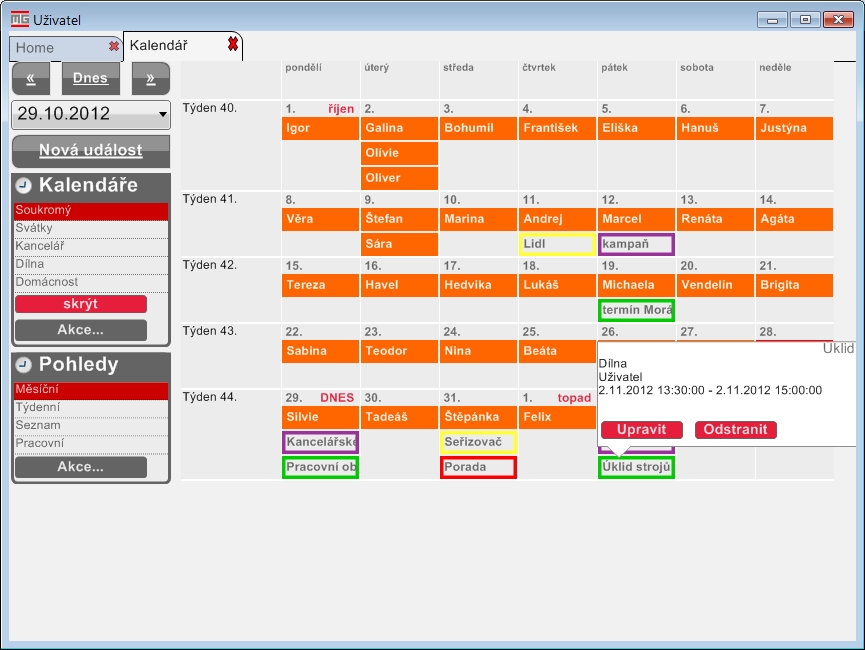 - repetarea evenimentelor zilnic, săptămânal (se pot specifica zilele săptămânii), lunar (în fiecare a x-a zi a lunii sau a x-a zi a lunii), anual,